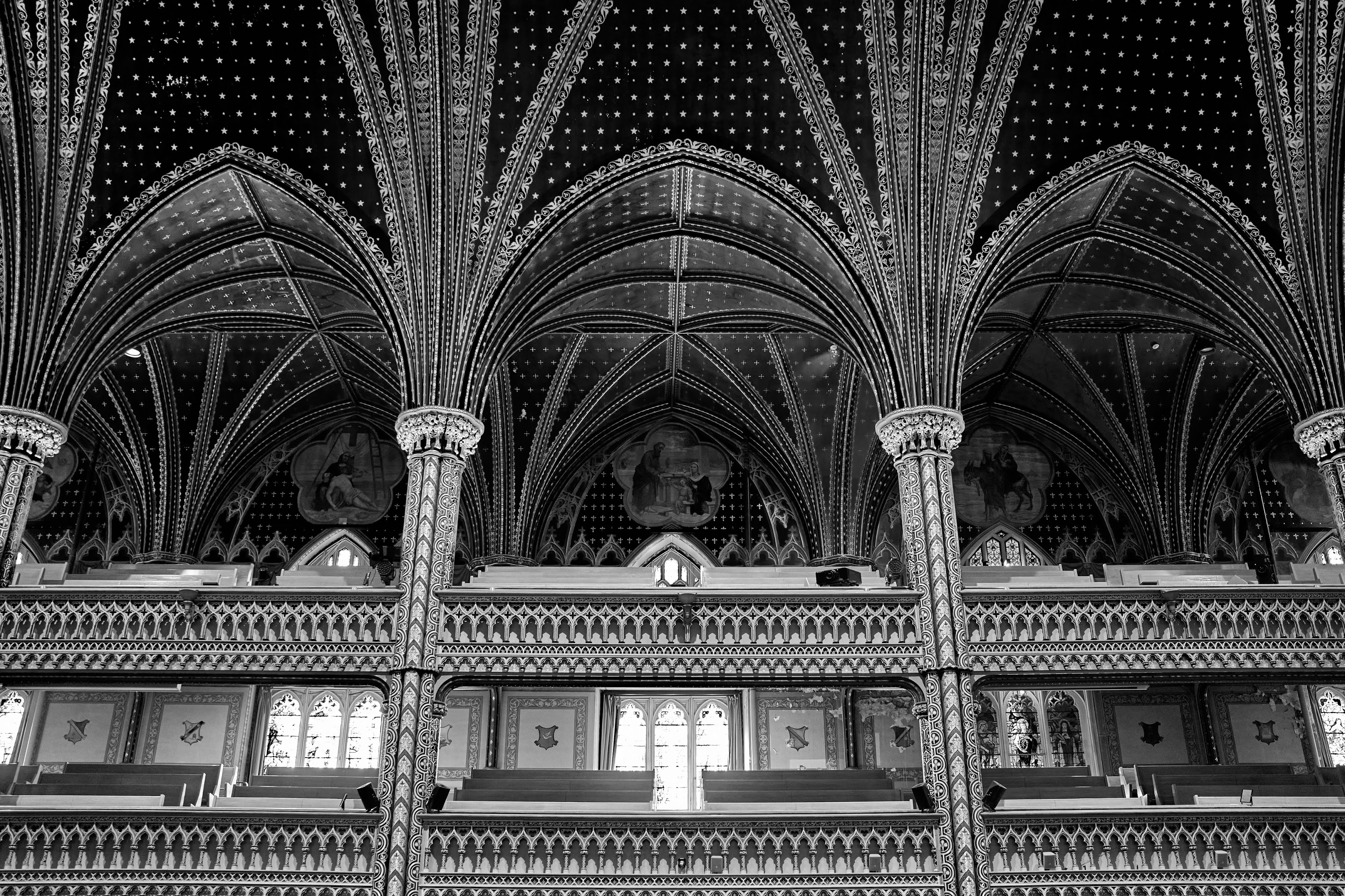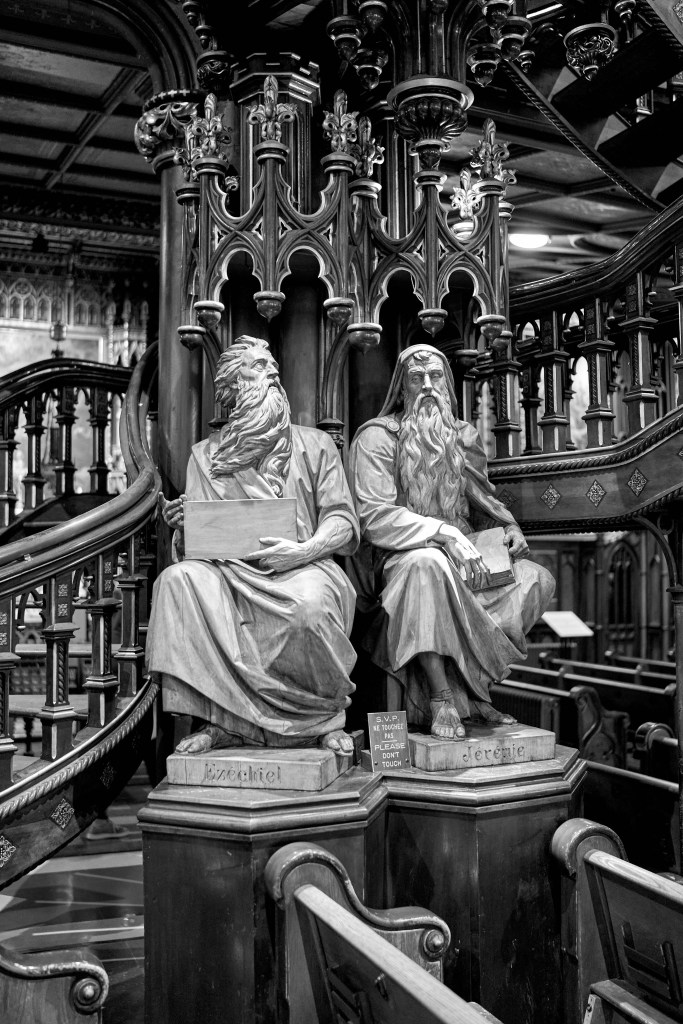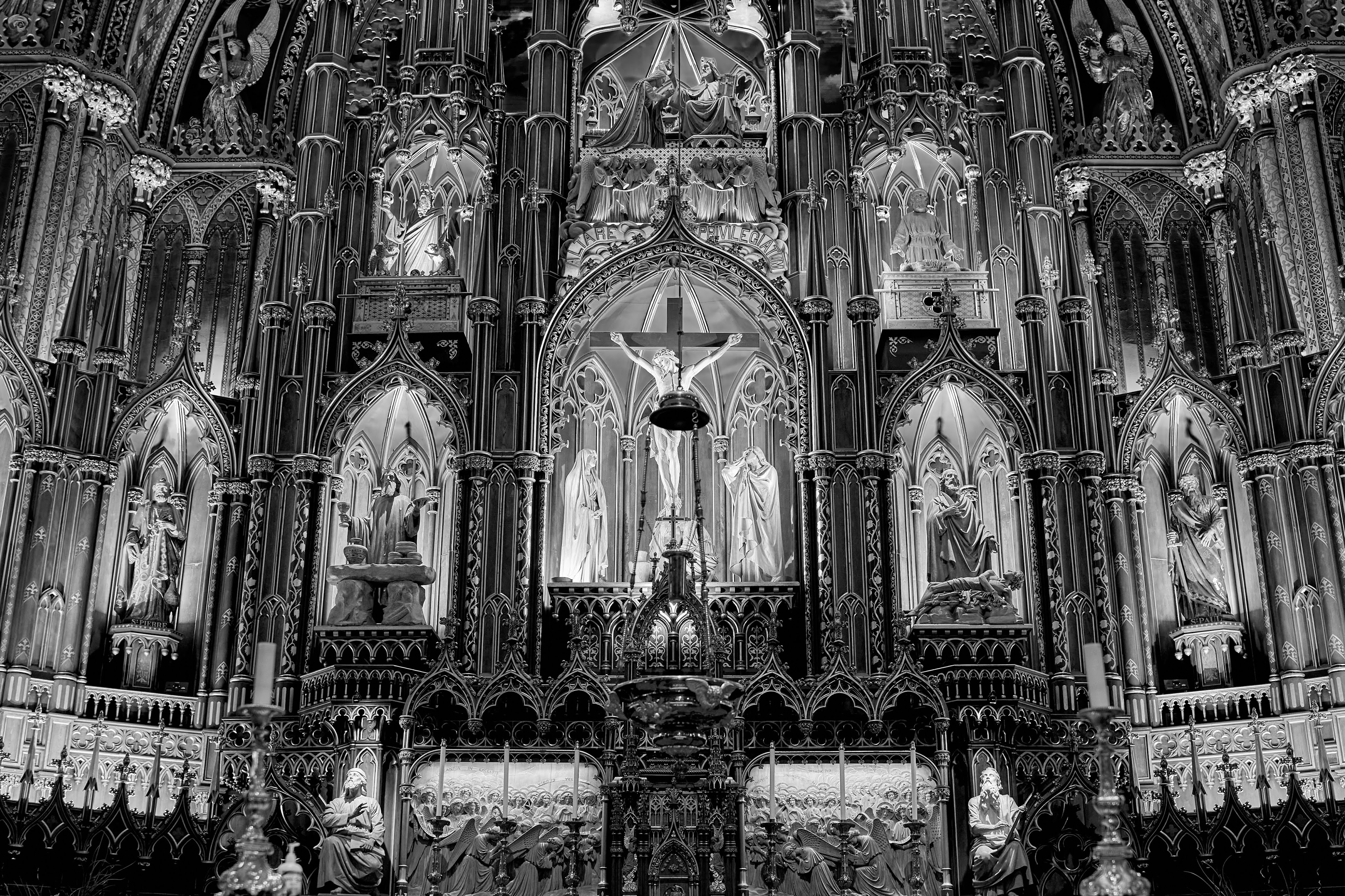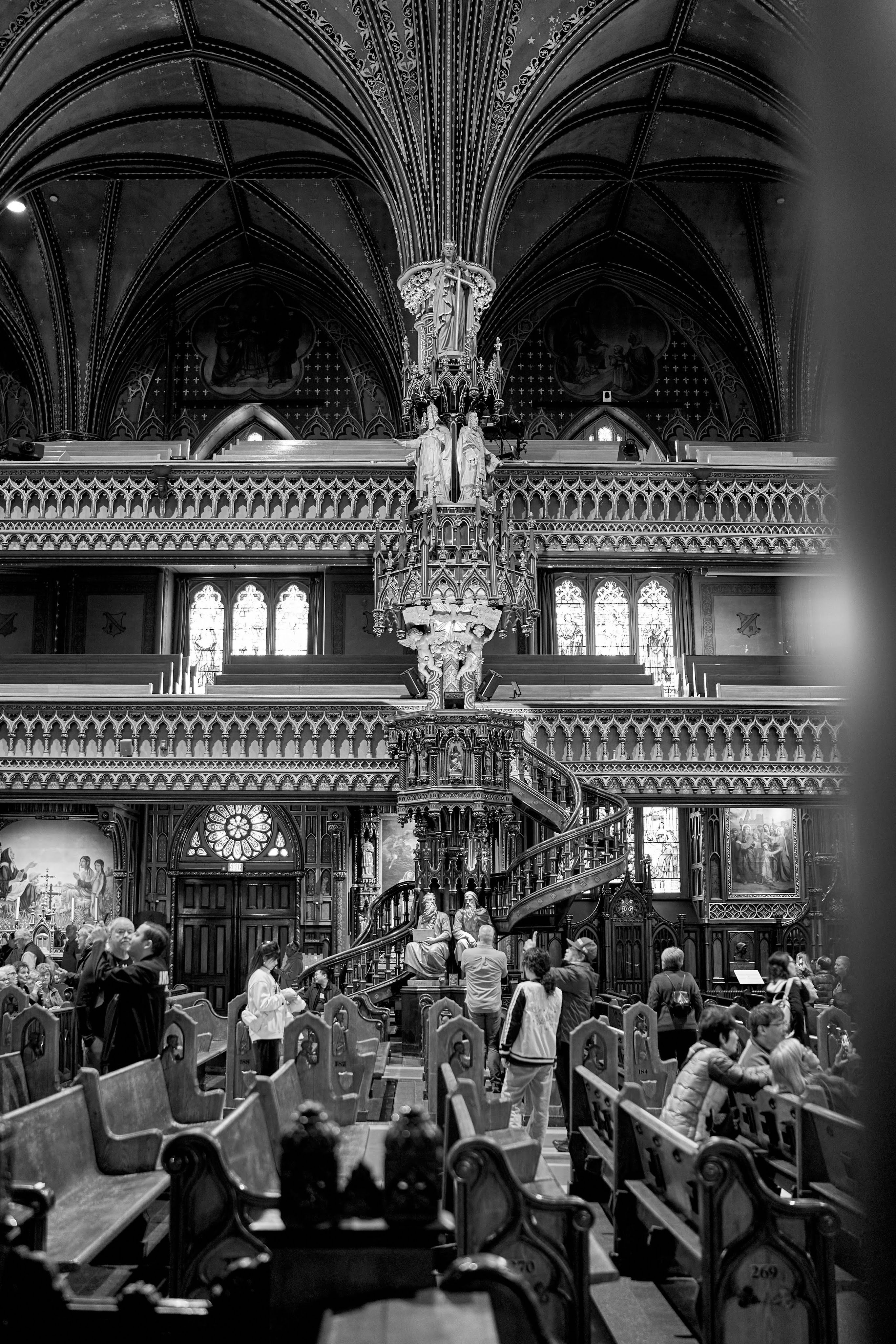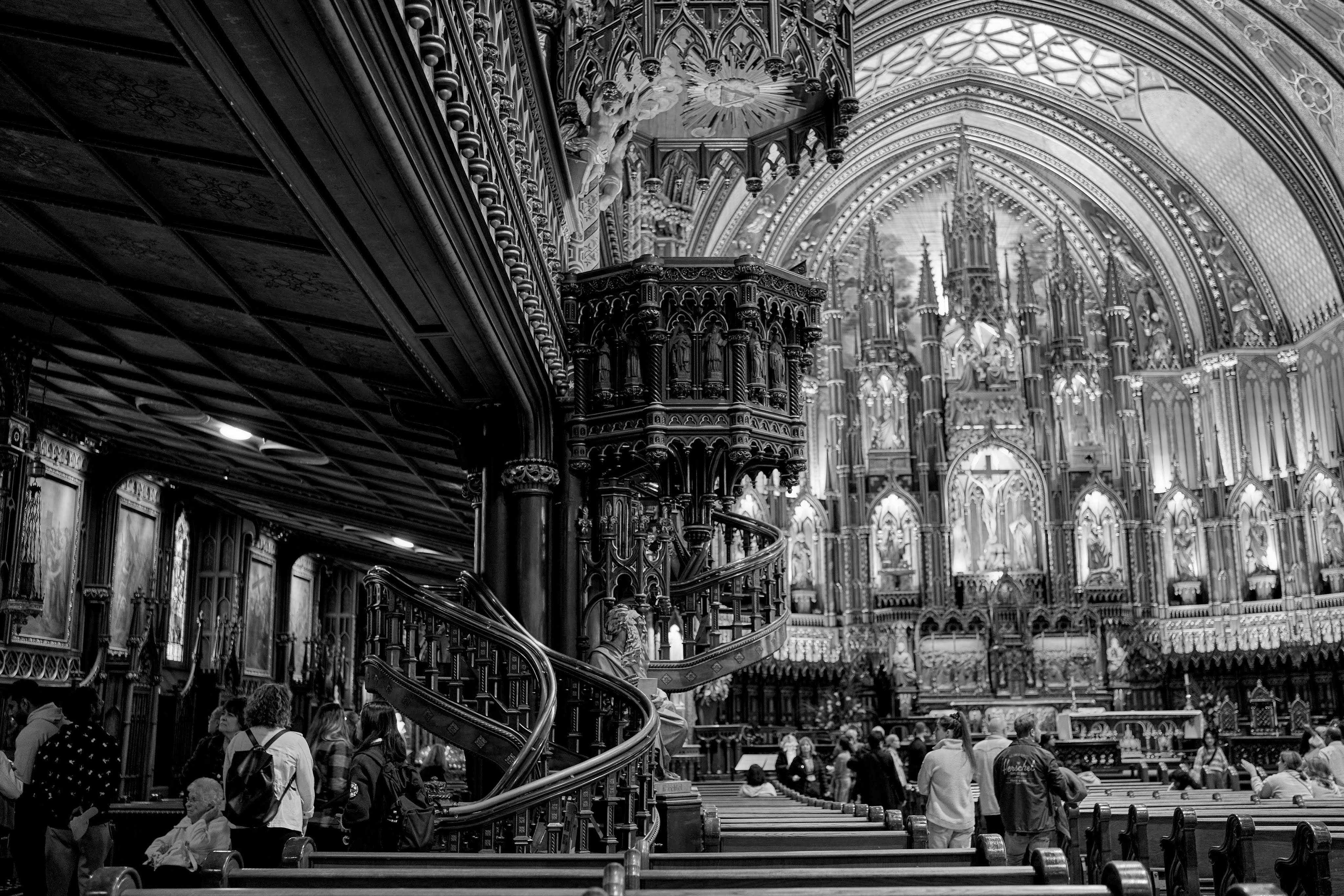 The monochrome palette transforms the Notre-Dame Basilica of Montreal into a dreamscape, where light and shadow weave an eternal story. Each image is a meditation in stillness, highlighting intricate details—pillars reaching upward, their carvings quietly narrating histories hidden in plain sight. The absence of color sharpens the focus, creating an intimate dialogue between viewer and architecture, revealing textures that might otherwise go unnoticed. These black-and-white frames strip away embellishment, distilling the space to its purest, most profound form.