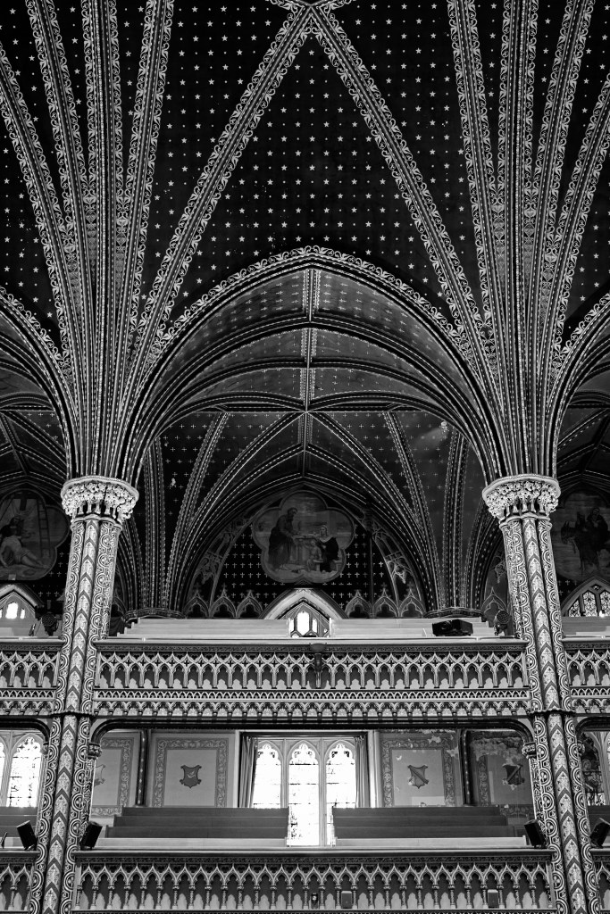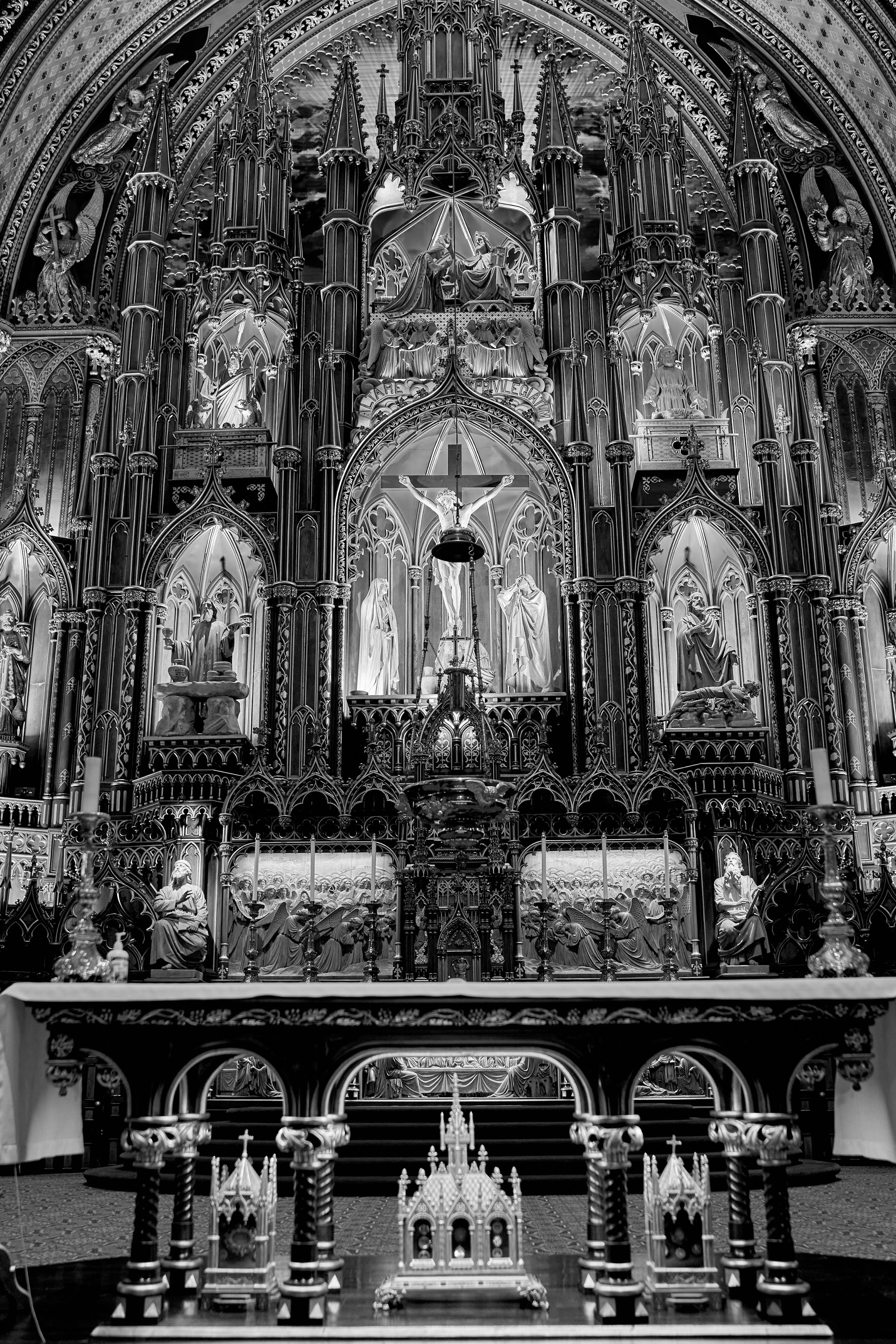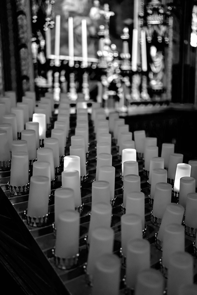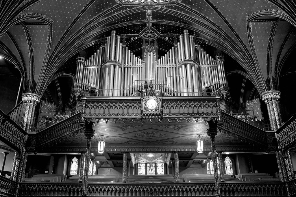 The pews stretch endlessly in a rhythm that feels timeless, guiding the eye naturally toward the altar—a masterful centerpiece of elegance and grace. In the stark simplicity of monochrome, the Basilica’s every curve and line finds its own voice, speaking in the language of light and form. The organ pipes, towering and stoic, gleam softly under gentle illumination, their silent presence adding an understated resonance. This quiet grandeur invites not just admiration but introspection, as though the space itself whispers of the countless stories and moments it has borne witness to.